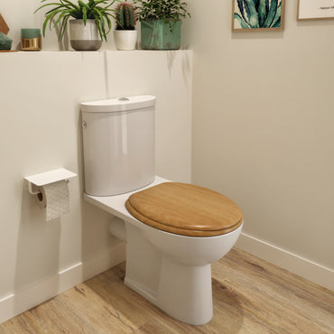 This toilet seat fits all standard WCs thanks to its adjustable hinges. Made in FSC wood, a natural and resistant material. Its metal hinges assure more durability