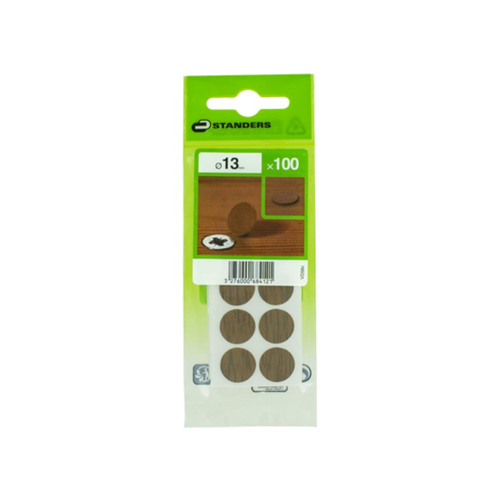 Description: The adhesive screw cover can cover countersunk head screws. With a diameter of 13mm, they allow to camouflage the screw by covering it easily. You can choose your screw cover color according to the color of your support. Here the screw cover is oak with a wood aspect. Main material: Polypropylene Standard or label: Not concerned Product without brand: No Composition of the product (in %) for customs: 100%pp Type of product: Screw cover Colour family: Brown Fixing type: Adhesive Product brand: STANDERS Number of pieces in the consumer unit: 100 Use 1: The adhesive screw cover can cover countersunk head screws Shape: Round Shape of the head: No head Screwhead type: Undetachable Advantage and benefit 1: With a diameter of 13mm, they allow to camouflage the screw by covering it easily Advantage and benefit 2: You can choose your screw cover color according to the color of your support. Here the screw cover is oak with a wood aspect Type of effect: Oak ADEO Productions warranty (in years): 2