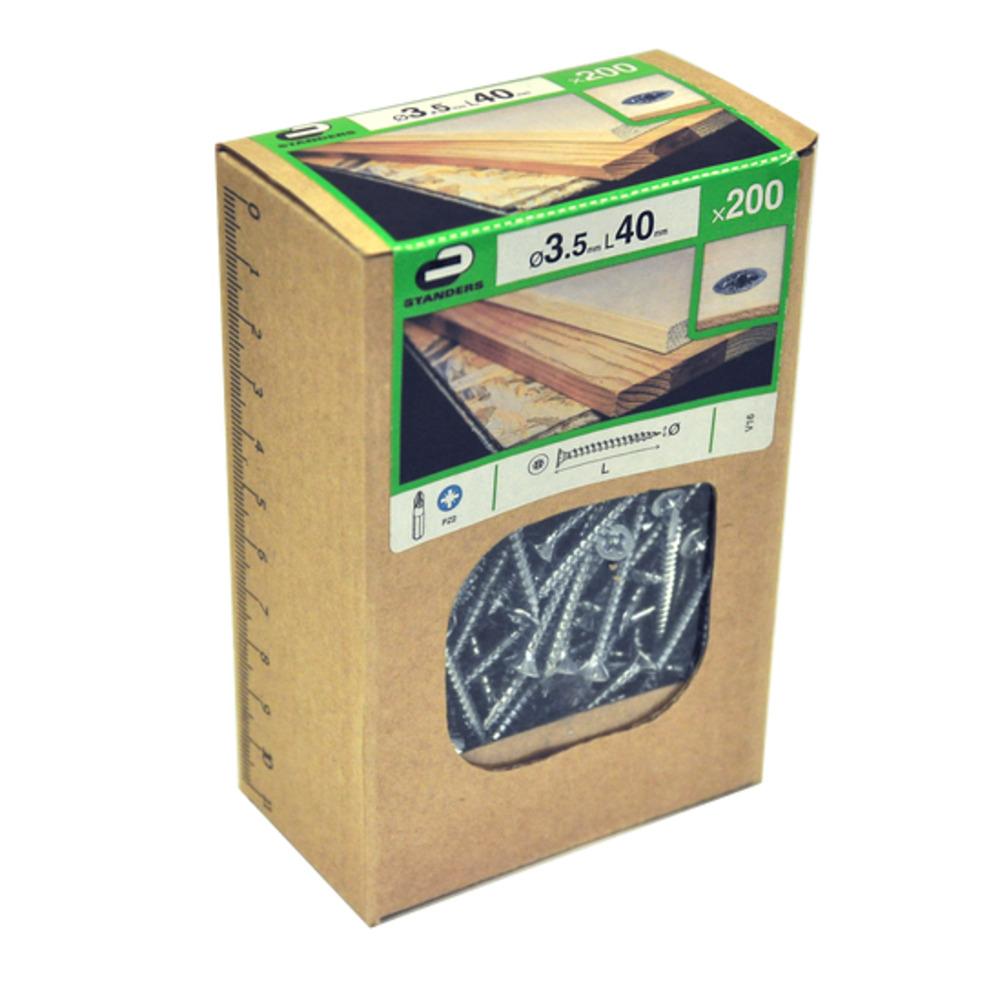 Description: This self-drilling screw for soft wood and agglomerated wood is the ideal screw for small indoor work. It allows to assemble pieces of wood together. You will save time as pre-drilling is not required. Indeed, its tip has been designed to penetrate directly in the wood. Thanks to its countersunk head, this screw is ideal for brackets with countersunk holes. The finishing will be flat and discreet. The fins under the head of the screw prevents loosening. Composition of the product (in %) for customs: 100 Self-sharpening: Yes Tool size: PZ2 Stainless steel type (hardware): Product without stainless steel Main material: Steel Product without brand: No Finishing of product: Zinc-plated Product brand: STANDERS Self-countersink: Yes Screwhead type: Pozidriv Commercial reference: V16-3.5x40-200D1 Type of product: Screw Material type applicability: Wood Self-perforating: Yes Place of use: Indoor Advantage and benefit 2: Thanks to its countersunk head, this screw is ideal for brackets with countersunk holes. The finishing will be flat and discreet Advantage and benefit 1: You will save time as pre-drilling is not required. Indeed, its tip has been designed to penetrate directly in the wood