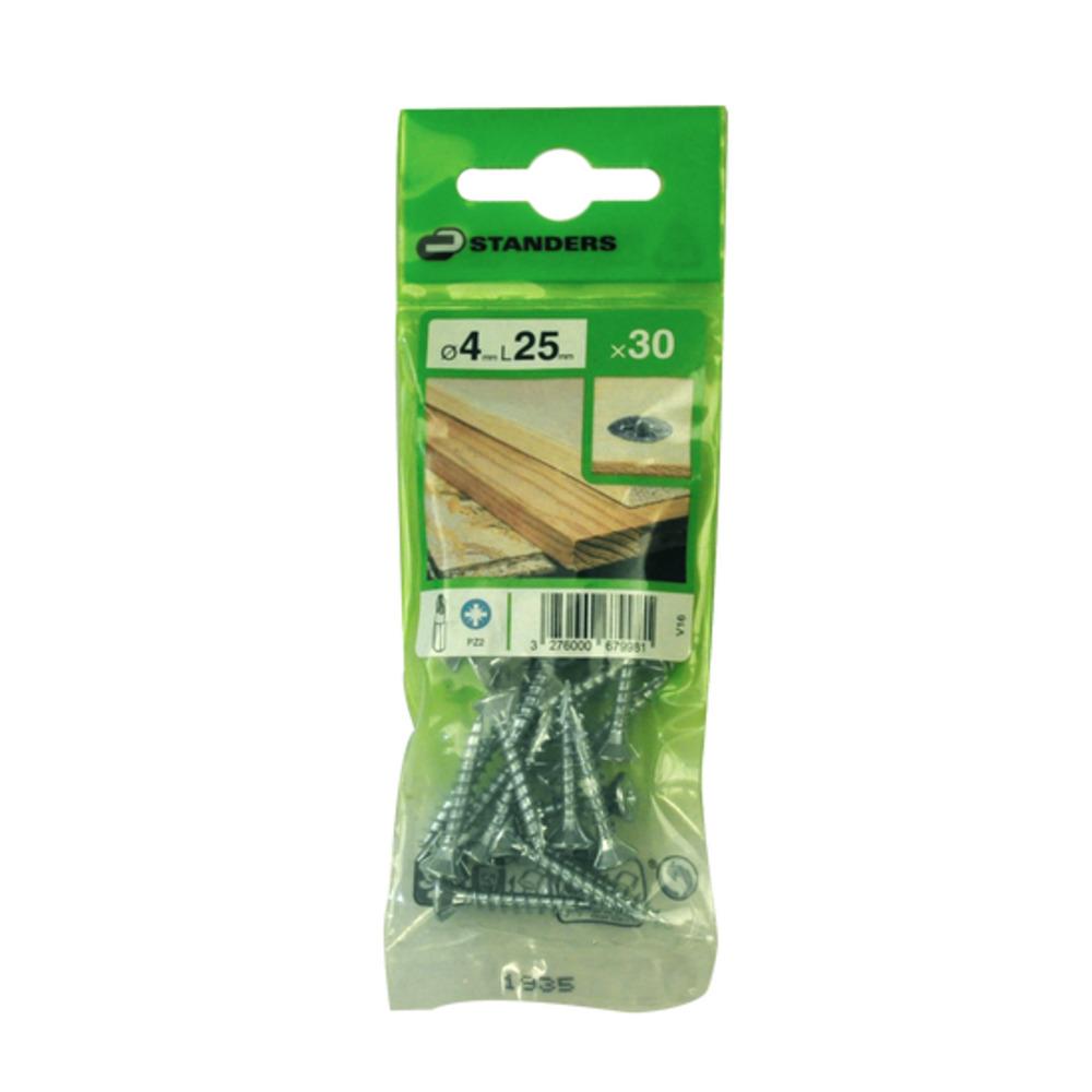 Description: This self-drilling screw for soft wood and agglomerated wood is the ideal screw for small indoor work. It allows to assemble pieces of wood together. You will save time as pre-drilling is not required. Indeed, its tip has been designed to penetrate directly in the wood. Thanks to its countersunk head, this screw is ideal for brackets with countersunk holes. The finishing will be flat and discreet. The fins under the head of the screw prevents loosenin. Composition of the product (in %) for customs: 100 Self-sharpening: Yes Tool size: PZ2 Stainless steel type (hardware): Product without stainless steel Main material: Steel Product without brand: No Finishing of product: Zinc-plated Product brand: STANDERS Self-countersink: Yes Screwhead type: Pozidriv Commercial reference: V16-4x25-30P1 Type of product: Screw Material type applicability: Wood Self-perforating: Yes Place of use: Indoor Advantage and benefit 2: Thanks to its countersunk head, this screw is ideal for brackets with countersunk holes. The finishing will be flat and discreet Advantage and benefit 1: You will save time as pre-drilling is not required. Indeed, its tip has been designed to penetrate directly in the wood