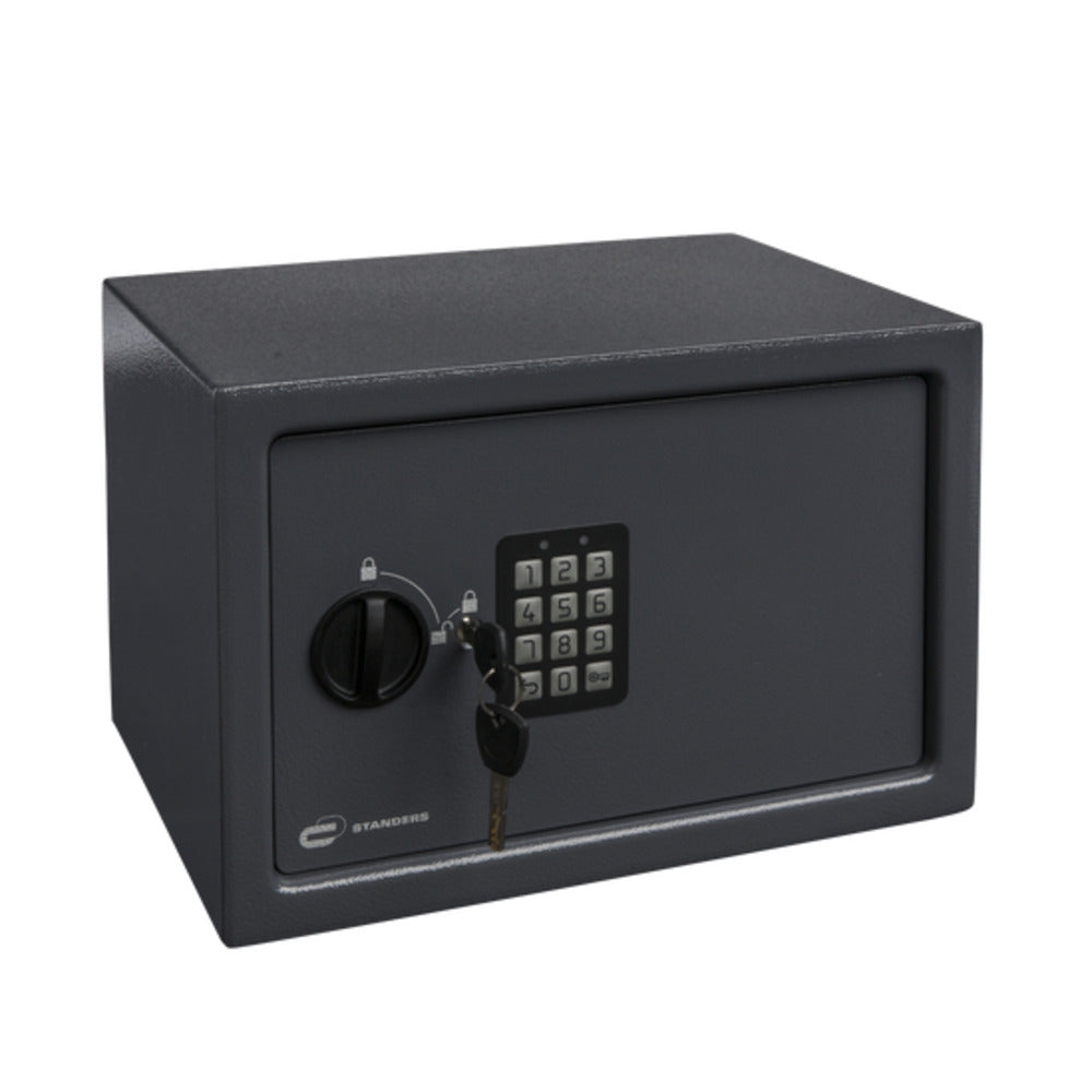 Description: Safe equipped by an electronic digit lock system that provides a high level of protection when it comes to storing valuables. 2 backup keys included in case of breakdown. Never store the key inside the safe. Ideal to store medium valuables such as cameras, phones, digital tablets, or game consoles. Electronic opening with user and master code system will help user experience in sharing and managing access to the safe. This safe is delivered with 2 flat keys that bring better security against lock picking. Safe provided with a removable shelf, in order to optimize according to your need your inside storage organization. This safe has an intermediate level of protection against attacks. Product without brand: No A2P certification: Not concerned Period of availability of spare parts after last purchase of last unit sold (in years): 10 Advantage and benefit 1: This safe has a intermediate level of protection against attacks Description: Safe equipped by an electronic digit lock system that provides a high level of protection when it comes to storing valuables. 2 backup keys included in case of breakdown. Never store the key inside the safe. Ideal to store medium valuables such as cameras, phones, digital tablets, or game consoles. Electronic opening with user and master code system will help user experience in sharing and managing access to the safe. This safe is delivered with 2 flat keys that bring better security against lock picking. Safe provided with a removable shelf, in order to optimize according to your need your inside storage organization. This safe has an intermediate level of protection against attacks. Opening direction: Right Composition of the product (in %) for customs: Steel: 97; Plastic: 1; Zinc alloy: 1 Safe certification: Not concerned Lock certification: Not concerned Main material: Steel Safety standard: EN 61000-6-1 and EN 61000-6-3 Destination: Floor, For documents, For small valuables, Wall Usage of the product: TO PROTECT SMALL ELECTRONIC DEVICES Waterproof: No Type of bolt: Fixed A2P certification number: N/A Accessory type: Product without accessory Door laser cutting: No Model name: SFT-25ENL2 Anti-removal protection: No Exterior dimensions (in cm): 25x35x25 Thickness of the door sheet metal (in mm): 4 Number of batteries required: 4 Interior dimensions (in cm): 24x34x20 Anti-knick down protection: No Fire-proof protection: No Thickness of the body sheet metal (in mm): 2 Required type of battery: LR06 AA 1.5 V Number of emergency keys: 2 Saw-proof protection: No Option to order additional emergency keys: Yes Number of shelves: 1 Emergency opening system: Key Finishing of product: Coated Batteries included: No Colour family: Grey / silver Type of emergency key: Flat Product brand: STANDERS Door opening: Manual Removable shelf: Yes Emergency key: Yes Usable access space (H.xL.) (in cm): 18.4x24.9 Number of bolts: 2 Installation type: For fixing Volume (in l): 16 Flap material: Product without flap Colour: Grey Accessories included: 2 keys Commercial reference: SFT-25ENL2 Type of key: Flat Fire-proof standard: Not concerned Battery included: No Type of product: Electronic code safe Type of lock: Electronic Hardware included: No Format: A4 Internet of Things (IoT): devices to be connected: No Appearance: Matt Use 1: Safe equipped by an electronic digit lock system that provides a high level of protection when it comes to storing valuables. 2 backup keys included in case of breakdown. Never store the key inside the safe Use 2: Ideal to store medium valuables as camera, phone, digital tablets, or game console Use 3: Electronic opening with user and master code system will help user experience in sharing and managing access to the safe. This safe is delivered with 2 flat keys that bring better security against lock picking. Never store the key inside the safe ADEO Productions warranty (in years): 5