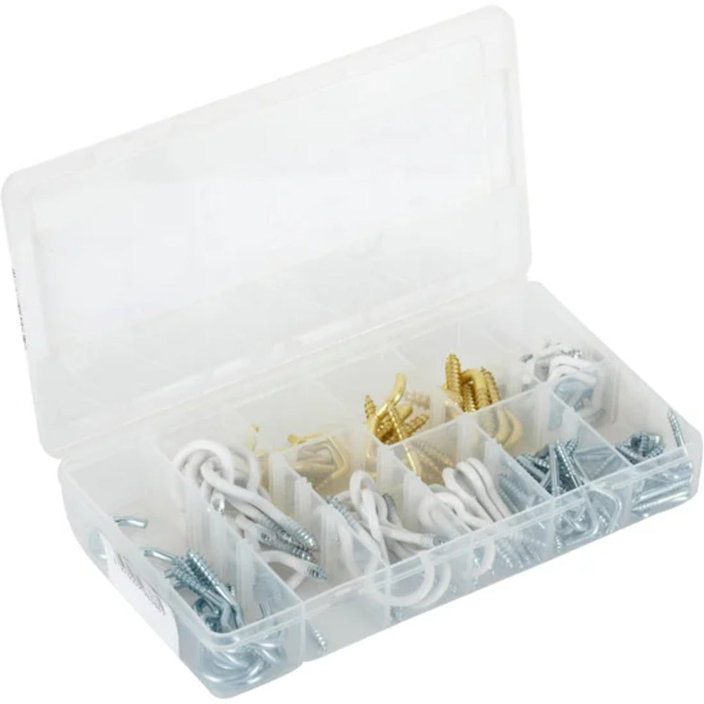 White Powder Coated Steel: 10 Hooks 4X30,10 Hooks 4.5X35Mm,10 Screweyes 4X30Mm,20 Square Hooks 4X30Mm /Zinc Plated Steel: 20 Square Hooks 3X30 20 Square Hooks 3.5X40,10 Hooks 4X30Mm/ Solid Brass: 10 Square Hooks 4X30Mm,10 Square Hooks 4.5X35