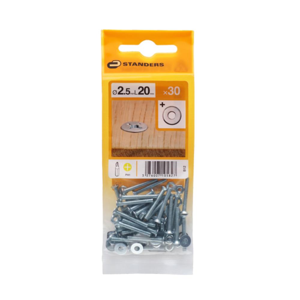 Description: Bolt with a countersunk head and Phillips drive. Suitable for wood and metals assemblies. Thanks to the washer per bolt included, the head of the bolt won't damage your material Main material: Steel Standard or label: DIN 965 Finishing of product: Zinc-plated Tool size: PH1 Product brand: STANDERS Screwhead type: Phillips Resistance class: 8.8 Commercial reference: B12-2.5X20-30P Advantage and benefit 2: Thanks to the washer per bolt included, the head of the bolt won't damage your material Product without brand: No Place of use: Indoor Composition of the product (in %) for customs: STEEL:100 Type of product: Bolt and metric screw Use 2: Suitable for wood and metals assemblies ADEO Productions warranty (in years): 2