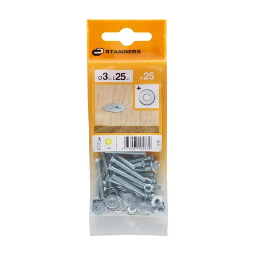 Description: Bolt with a countersunk head and Phillips drive. Suitable for wood and metals assemblies. Thanks to the washer per bolt included, the head of the bolt won't damage your material Main material: Steel Standard or label: DIN 965 Finishing of product: Zinc-plated Tool size: PH1 Product brand: STANDERS Screwhead type: Phillips Resistance class: 8.8 Commercial reference: B12-3X25-25P Advantage and benefit 2: Thanks to the washer per bolt included, the head of the bolt won't damage your material Product without brand: No Place of use: Indoor Composition of the product (in %) for customs: STEEL:100 Type of product: Bolt and metric screw Use 2: Suitable for wood and metals assemblies ADEO Productions warranty (in years): 2 Number of pieces in the consumer unit: 25 Minimum percentage of recycled content in the product (in %): 0 List of substances of very high concern contained in the product in concentration greater than 0.1% in mass percentage: Not concerned Contains substances of very high concern in the product in a concentration greater than 0.1% by mass percentage: No Packaging recyclability: Not concerned Number of manufacturing sites making the products: 1 Percentage of recycled content into the main material of the product: 0 Product recycled content evidence: No evidence Materials of the primary packaging (sales unit) of the product: Low Density PolyEthylene (LDPE) - Virgin Manufacturing site(s) of the product is quality certified or audited: Yes ADEO quality audit B Manufacturing site(s) of the product is socially certified or audited: Yes social ICS audit B Manufacturing site(s) of the product is environmentally certified or audited: Yes environmental ICS audit B