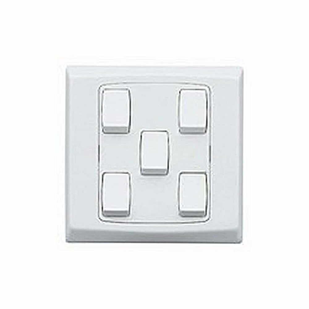 The Taili Klepp Small Rocker Switch is a 10A 5 Gang 2 Way switch in a sleek white design. This switch is perfect for controlling multiple lights or appliances in a room. With its rocker design, it is easy to operate and blends seamlessly into any decor. The 2-way functionality allows you to control the same set of lights or appliances from two different locations. This switch is durable and reliable, making it a great addition to any home or office space. Please note that this switch does not come with the frame included. So, another purchase would need to be done using the code P057792.