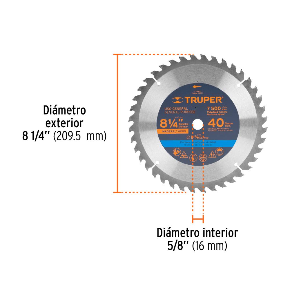 The circle blade*40, 8-1/4 - Truper is a high-quality circular saw blade designed for use with 8-1/4 inch circular saws. This blade features 40 teeth and is made from durable materials for long-lasting use.The circle blade*40, 8-1/4 - Truper is an excellent circular saw blade for anyone looking for a reliable tool for cutting wood, plastic and other materials. This blade is designed for use with 8-1/4 inch circular saws and is compatible with a wide range of saws, making it a versatile tool to have in your toolbox. This circular saw blade features 40 teeth, which provides smooth and efficient cutting performance. The blade is made from high-quality, durable materials, ensuring that it can withstand heavy use and last for years. The circle blade*40, 8-1/4 - Truper is easy to use and can be quickly attached to an 8-1/4 inch circular saw. It is designed to provide precise cuts and can be used to cut a wide range of materials, including wood, plastic and other materials. This circular saw blade is designed with safety in mind. It features a reinforced shoulder that helps prevent kickback and makes it easier to control the saw during use. The blade also has precision ground teeth that reduce splintering and ensure a smooth, clean cut.