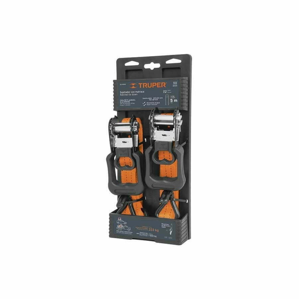 made with 100% polyester tape, which does not deform. Double J hook with topicalized corrosion resistant coating. Handle with plastic cover for greater comfort. Double locking safety that keeps the ratchet in the closed position.