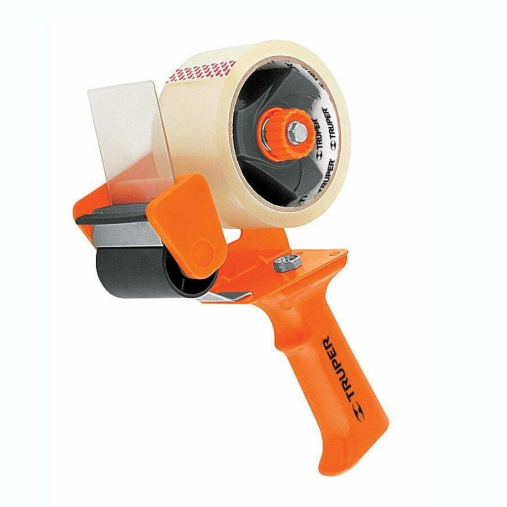 Made of steel and high-impact polypropylene. Lightweight pistol-type dispenser with "roll-on" system that facilitates centered sealing of boxes. Easy to load. Includes Two 50 m rolls of transparent tape with acrylic adhesive. Uses: For closing cardboard boxes, holding or joining objects in packaging operations. For tapes 48 mm wide and 77 mm internal diameter.
