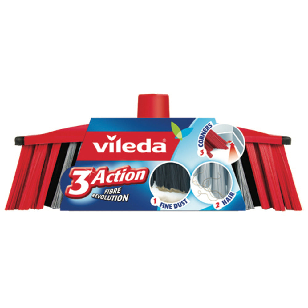 The Vileda 3Action broom is the first to have three different types of bristles to effectively collect dirt: 1) the medium-thickness Grey Fibres are arranged diagonally to convey dirt towards the centre of the broom; they are ideal for collecting hair, hair and crumbs. 2) the Black Fibres, on the other hand, are very thin, arranged to form a barrier. Ideal for capturing fine dust without lifting it into the air and without leaving residues after the broom passes. 3) the Red Fibres are more rigid and inclined laterally, perfect for easily reaching corners, edges and gaps. The Vileda 3Action broom has an ultra-modern design that makes it light and easy to handle... and can be cleaned easily! It collects dirt in a single pass thanks to its bristles that perform three actions in one: barriers of ultra-thin bristles for dust, bristles in rectangular tufts for crumbs and hair, longer bristles to reach corners.