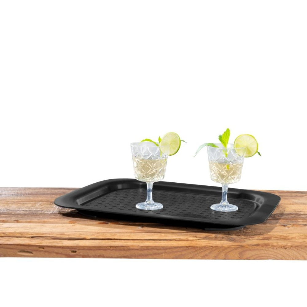 The modern plastic tray in glorious black is the ideal solution for transporting food and drinks in a stable manner. The curves on the sides serve as practical carrying handles - so you always have a firm grip on the tray with both hands. Serve without anything slipping out of your hands: The tray has a non-slip surface, so that filled glasses, bottles and food remain stable on the way to the table or the barbecue. The bottom of the tray is textured so it does not slide on the table. High-quality materials: The Outdoor Kitchen non-slip tray is made of high-quality plastic. The anthracite-colored anti-slip studs are made of TPE plastic. Versatile in use: You can also use the large XL tray with dimensions of 45.5 x 2.3 x 33 cm as part of your own minibar. You can transport dirty dishes and clean cutlery from one place to another conveniently and reliably.