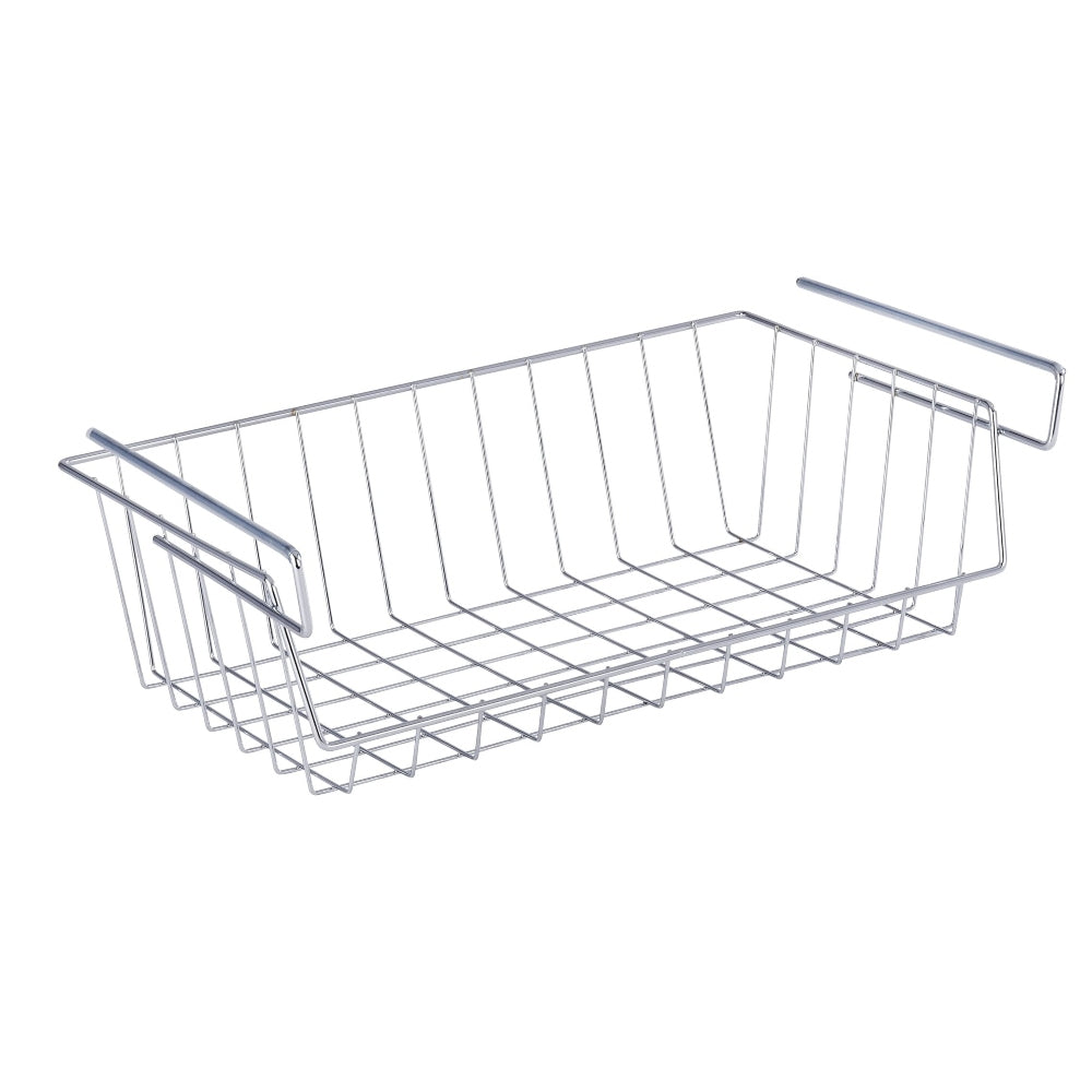 This practical hook-in chrome basket is simply hooked onto a rack or cupboard shelf. Therefore, the storage basket creates additional space in the kitchen, bedroom, and throughout the household. It is ideally suitable for the storage of serviettes, kitchen roll, socks, and accessories. The basket is prevented from slipping by the rubber coating on the holder.