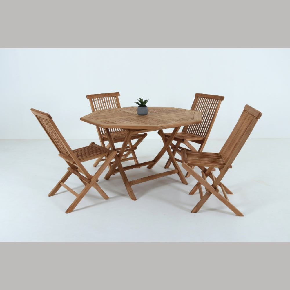 This beautiful teak octagonal folding table set is perfect for outdoor dining or gathering with family and friends. The table is 120cm in diameter and features a classic octagonal design. It is made from high-quality teak wood, known for its durability and natural resistance to the elements. The set comes with four matching chairs, also made from teak wood, and each chair features a comfortable slatted back and seat. The chairs can be easily folded for convenient storage when not in use. This teak octagonal folding table set is perfect for any outdoor space, whether it be a patio, garden, or poolside area. The natural wood finish adds a touch of elegance to any outdoor setting, and the sturdy construction ensures years of enjoyment.